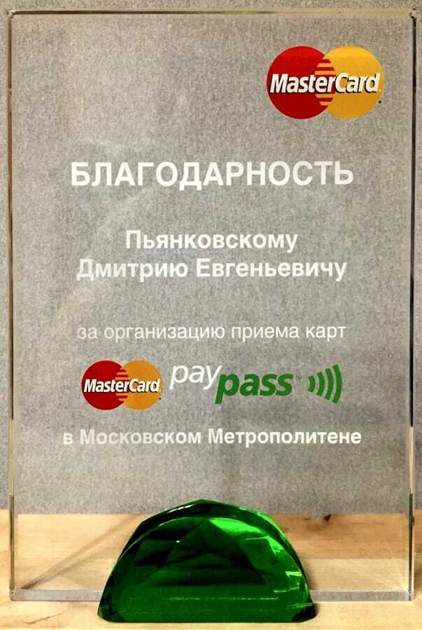 Получена благодарность MasterCard за организацию приёма карт paypass в Московском метрополитене.